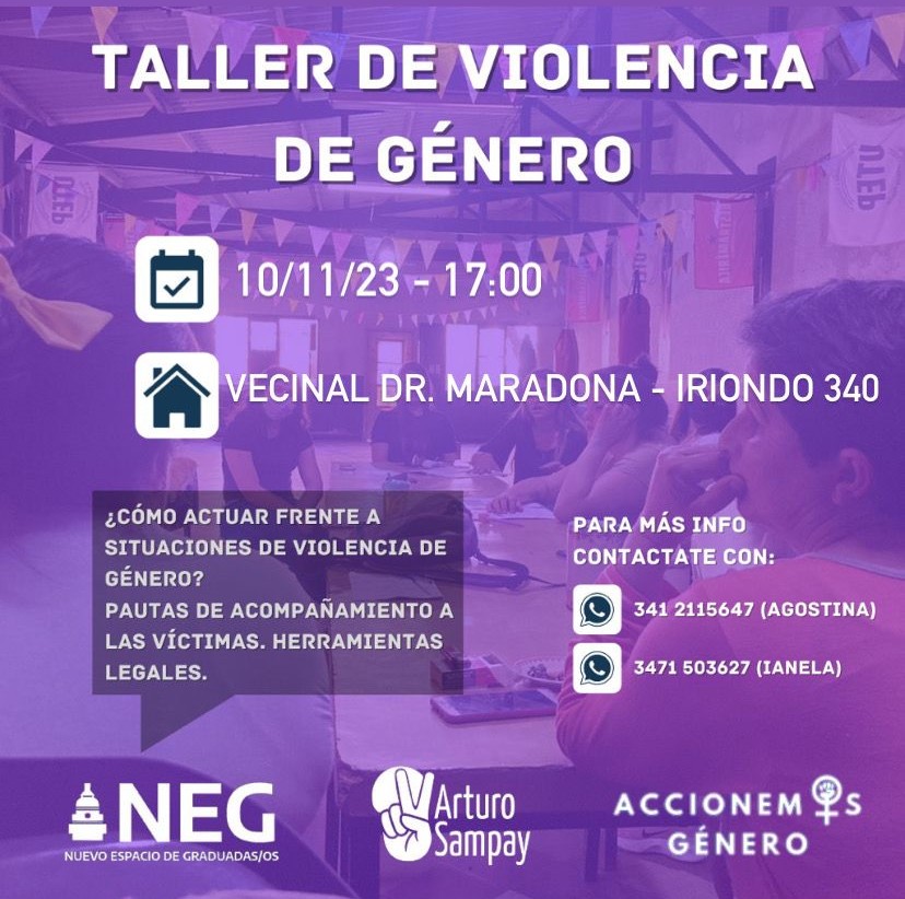 Nota de RosarioPlus. La Vecinal Dr. Maradona y la Asociacion Civil de Acceso a los Derechos realizarán este viernes 10 de noviembre a las 17 una jornada de capacitación, reflexión y asesoramiento para actuar ante situaciones de violencia de género. Liza Feldman forma parte de las dos instituciones e invitó a vecinos y vecinas a formar parte de la actividad conjunta, en la que se brindará asesoramiento jurídico sobre cómo actuar frente a situaciones de violencia de género.